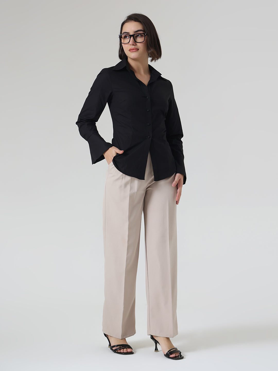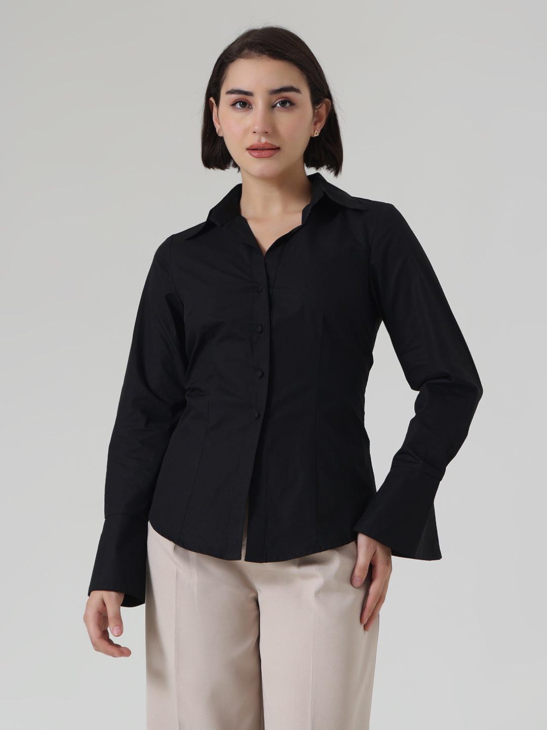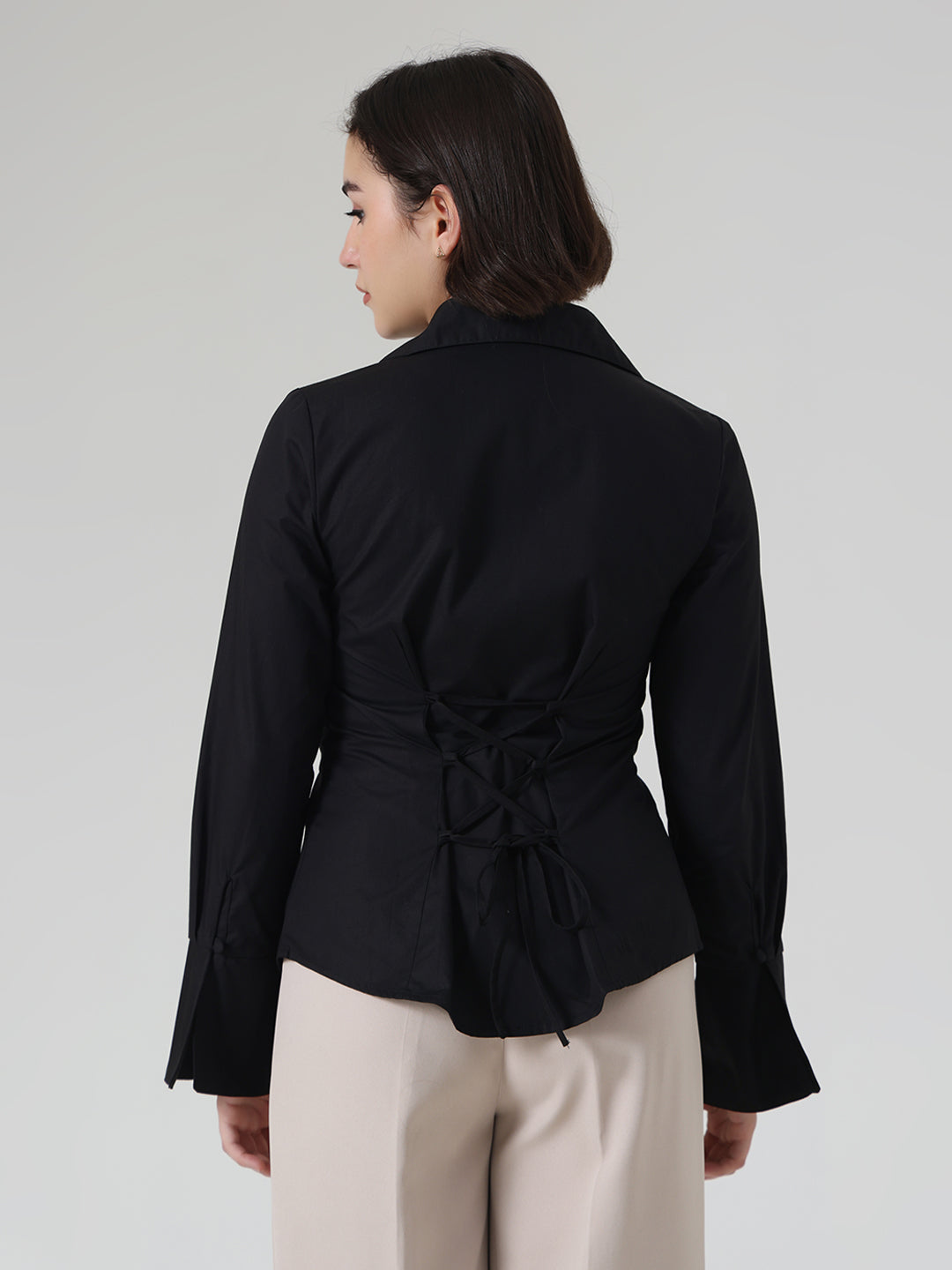 This fitted shirt is crafted from crisp cotton with a timeless pointed collar. It features flared cuffs and a discreet lace-up back for a sophisticated, adjustable fit, offering a modern take on a classic silhouette.