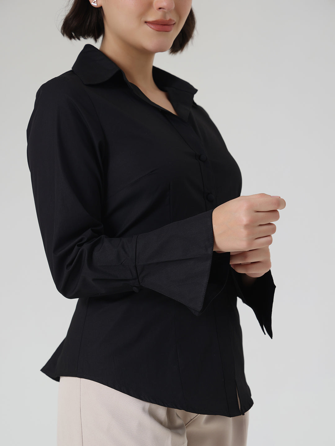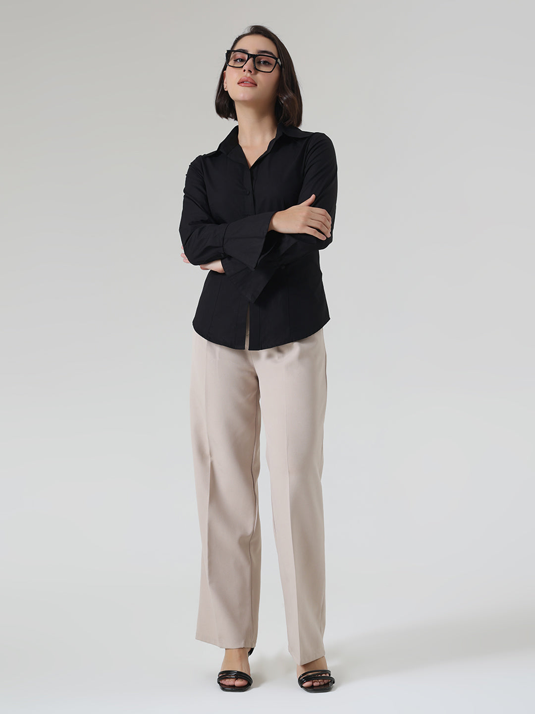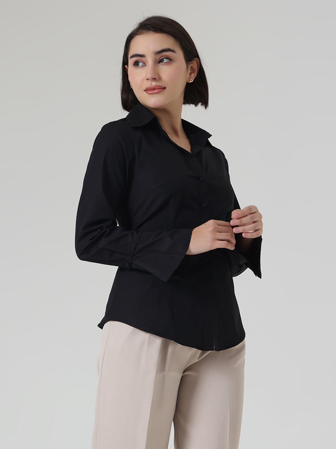 This fitted shirt is crafted from crisp cotton with a timeless pointed collar. It features flared cuffs and a discreet lace-up back for a sophisticated, adjustable fit, offering a modern take on a classic silhouette.